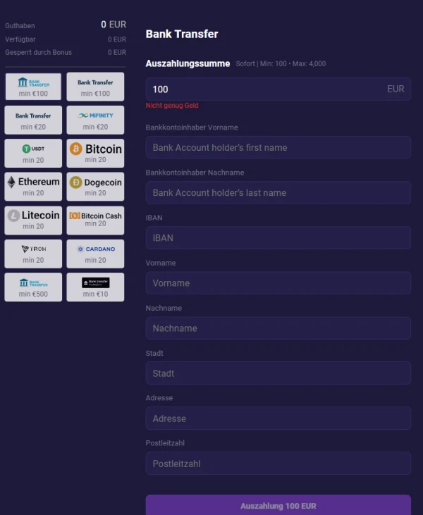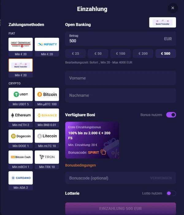 Spirit Casino unterstĂĽtzt EUR-Einzahlungen per Bankkarte, lokalen Optionen, E-Wallets, Prepaid und Krypto. Die meisten Einzahlungen sind sofort, sodass dein Guthaben direkt aktualisiert wird. Auch Auszahlungen sind flexibel: sofortige Optionen ĂĽber E-Wallets und Krypto sowie BankĂĽberweisung fĂĽr klassische Auszahlungen.