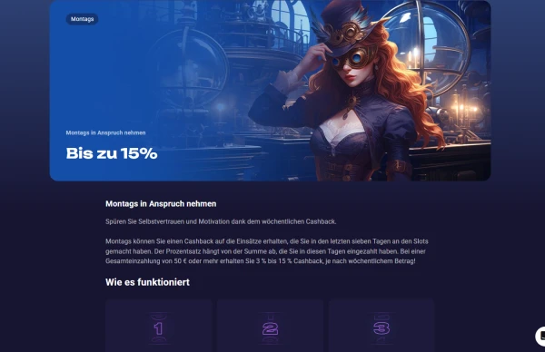 | Wöchentlicher Cashback | 3% bis 15% Cashback auf wöchentliche Slot-Verluste | Gilt für Slots; Prozentsatz hängt von Level und Aktivität ab |