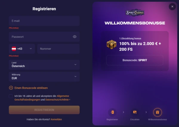 Ein Konto bei Spiritcasino zu erstellen dauert nur ein paar Minuten, und du kannst mit einer Einzahlung ab €20 starten. Für sicheres Spielen und reibungslose Auszahlungen bitten wir alle Nutzer, die Identitätsprüfung abzuschließen. Das hilft uns auch, Konten vor Missbrauch zu schützen und Zahlungsmethoden in den richtigen Händen zu halten.