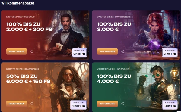 Unser Willkommenspaket ist auf vier Einzahlungen aufgeteilt und startet ab €20. Das vollständige Willkommensangebot bei Spiritcasino umfasst: 1. Einzahlung 100% bis €2.000 + 200 Freispiele; 2. Einzahlung 100% bis €3.000; 3. Einzahlung 50% bis €6.000 + 150 Freispiele; 4. Einzahlung 100% bis €4.000. Jede Stufe hat eine 40x Umsatzbedingung und dieselbe Mindesteinzahlung von €20. Einen Promo-Code führen wir im Hauptablauf für dieses Angebot nicht auf, und es gibt keinen Sport-Willkommensbonus, da wir kein Sportwettenangebot betreiben. Wenn du nach einem Spiritcasino Casino Bonus ohne Einzahlung suchst, beachte bitte, dass dieser derzeit nicht verfügbar ist; unser Haupteinstiegsangebot ist ein Einzahlungsbonus.